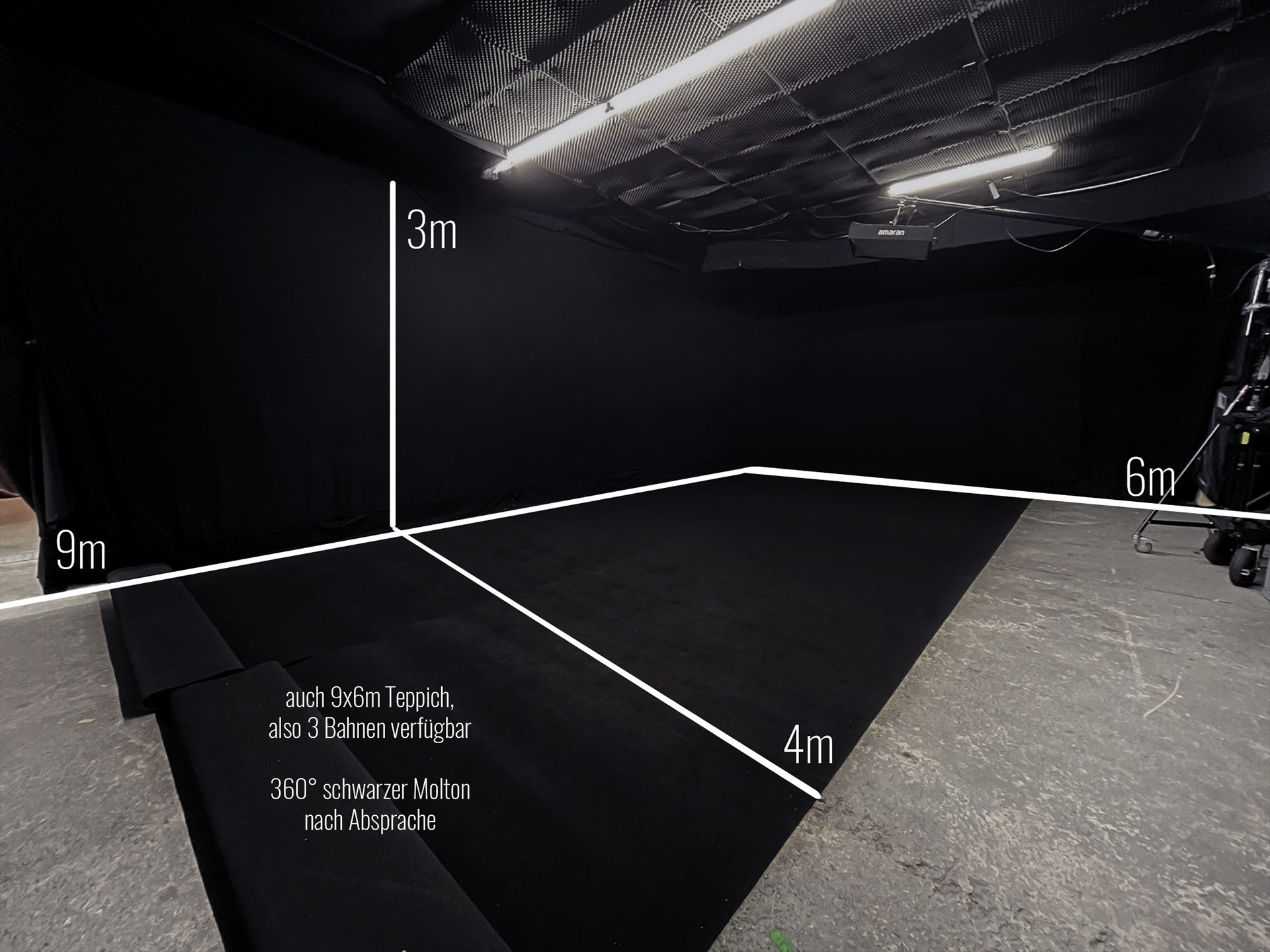 9x6 Meter Blackbox Filmstudio (schwarzer Molton und Teppich) mit 3 Metern Deckenhöhe – speziell für Musikvideos. Miete nur die Fläche, zusätzlich Equipment oder auch Kamera- und Lichtcrew.